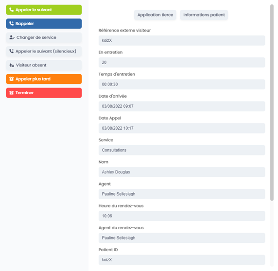 Wanneer een bezoeker in consultatie is, worden zijn gegevens rechts van de knoppen weergegeven.