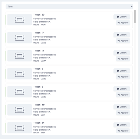 Rechts van de kolom met de details van de lopende consultatie staat de lijst met wachtende tickets.