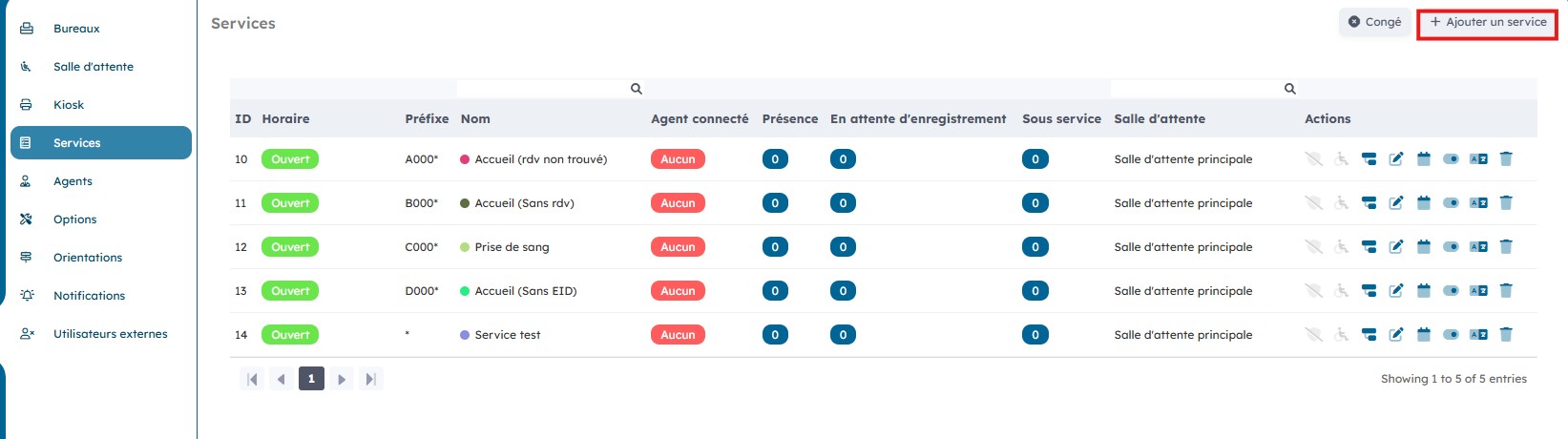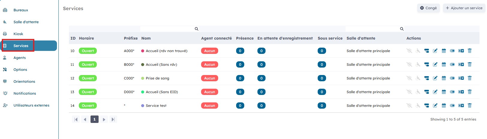 Sur la page « Service » vous avez une vue d’ensemble sur les différents services ainsi que sur le nombre d’agents connectés par service, le nombre de patients présents et ceux en attente d’enregistrement.