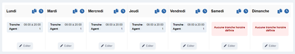 Il est possible d’éditer les tranches horaires de chaque jour ainsi que le nombre d’agents en cliquant sur « Éditer ».