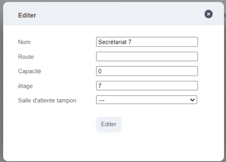 En cliquant sur l’icône « Éditer », vous pouvez modifier les informations liées à une salle d’attente déjà créée.