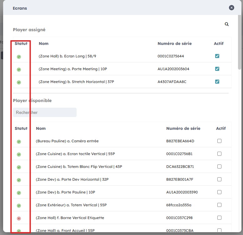 En cliquant sur l’icône « Écrans », vous avez accès à une fenêtre qui vous donne des informations sur le statut de chaque écran.
