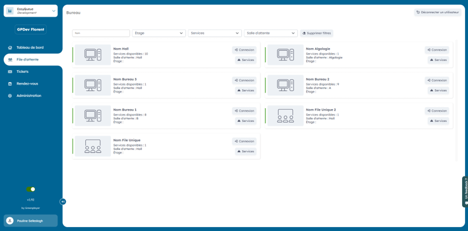 La gestion des files d’attente a lieu dans l’onglet « File d’attente ». Cet onglet permet d’avoir une vue d’ensemble sur les différents bureaux et de pouvoir s’y connecter.